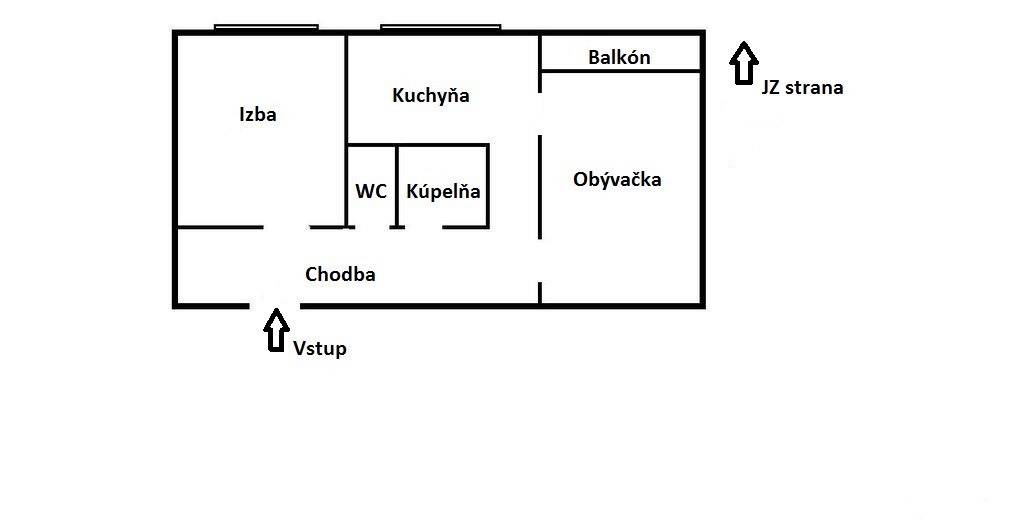 Dispozične byt pozostáva z vstupnej chodby, spálne, delenej toalety od kúpeľne, obývačky a samostatnej kuchyne.