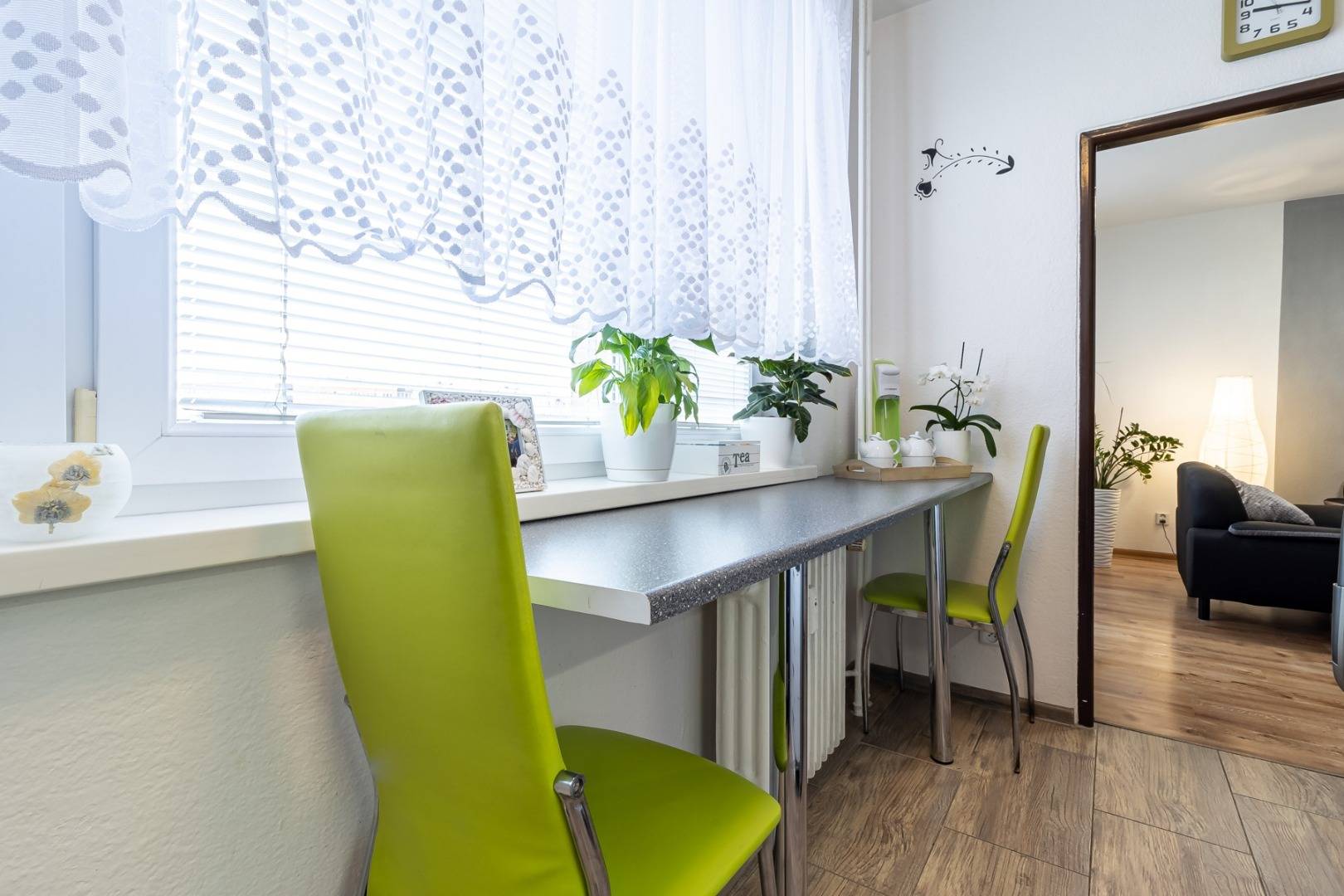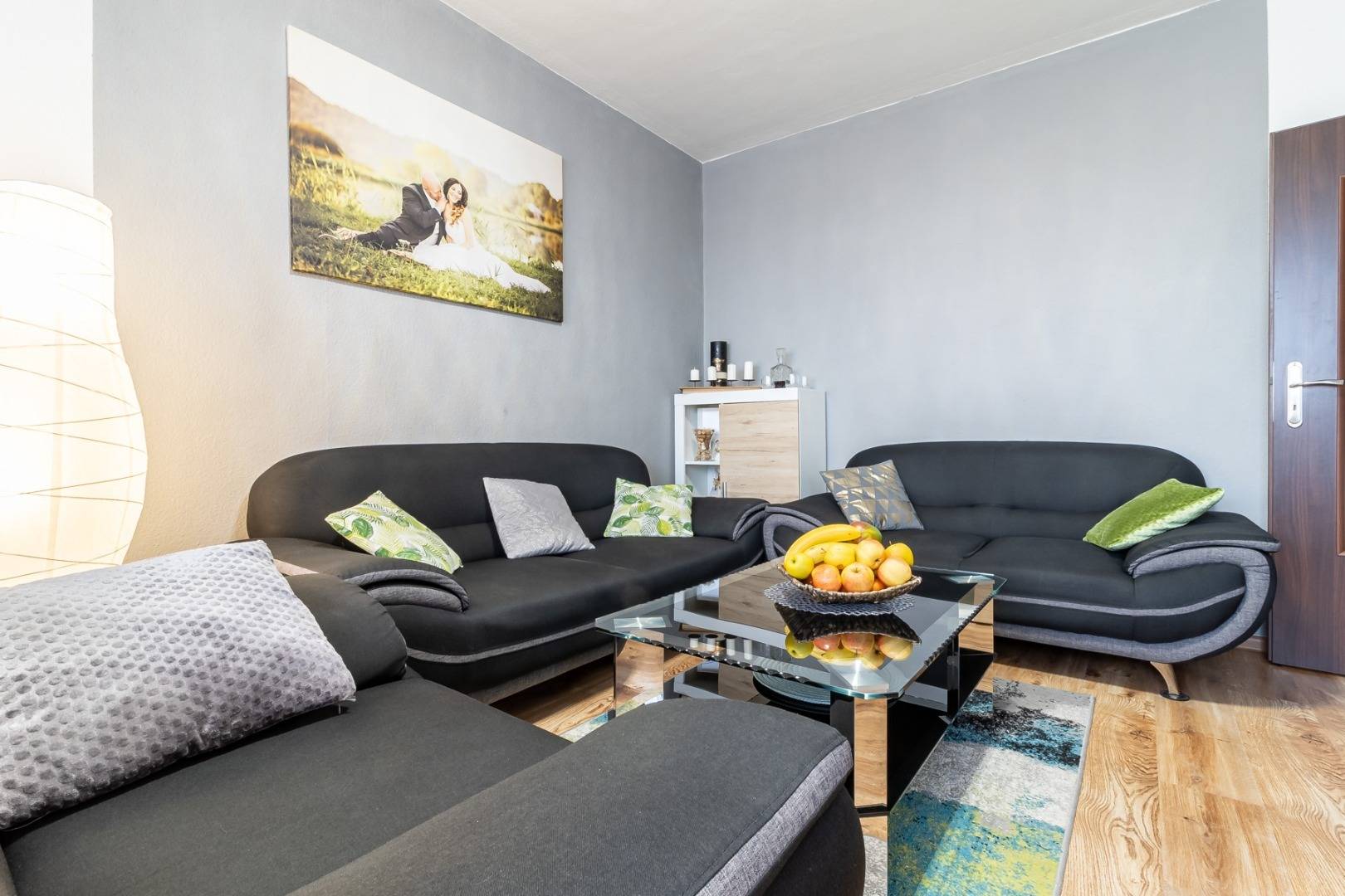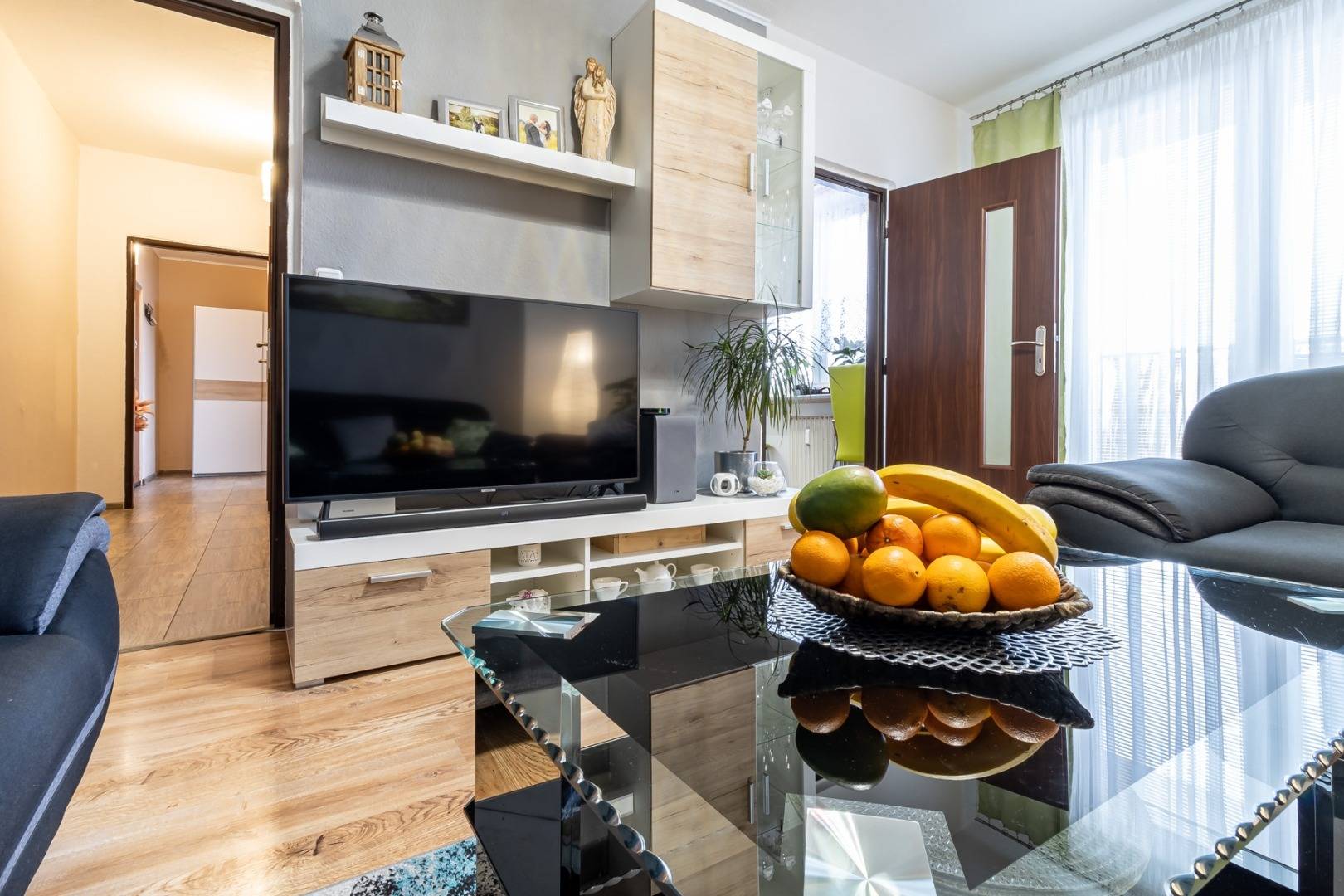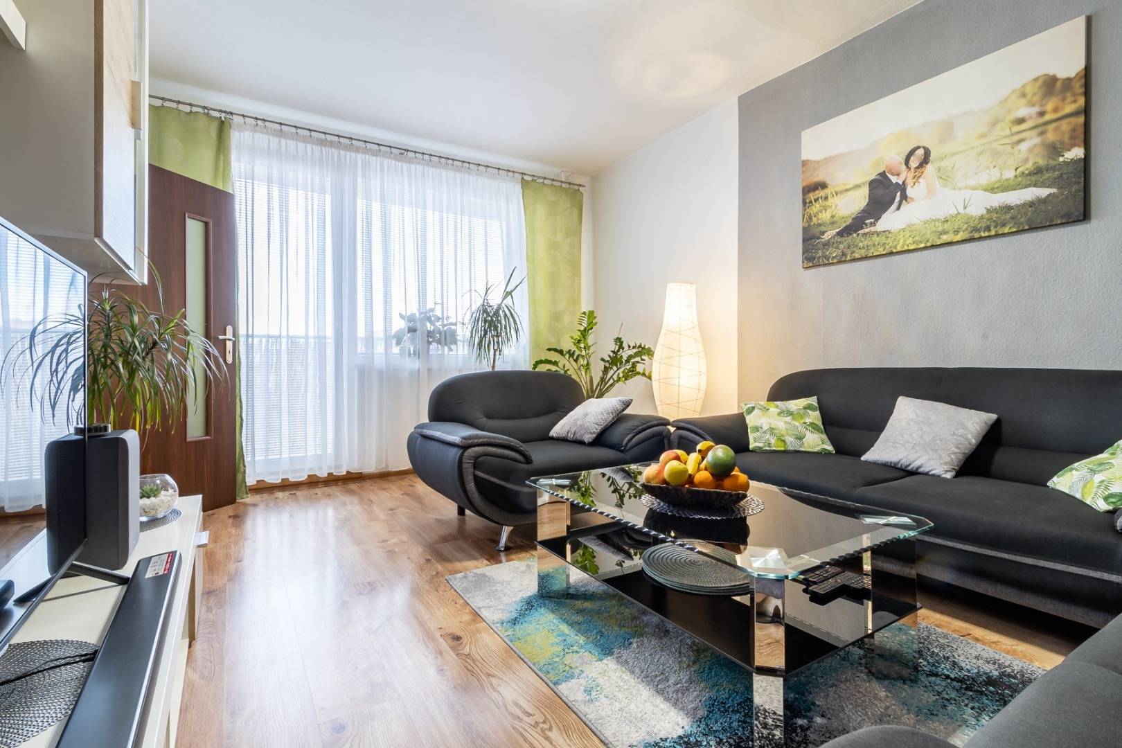 Obývačka je priestranná s výstupom na balkón. Z obývačky je priami vstup do zariadenej kuchyne.