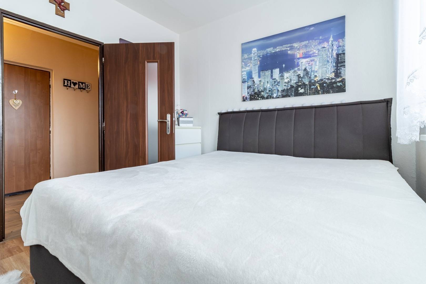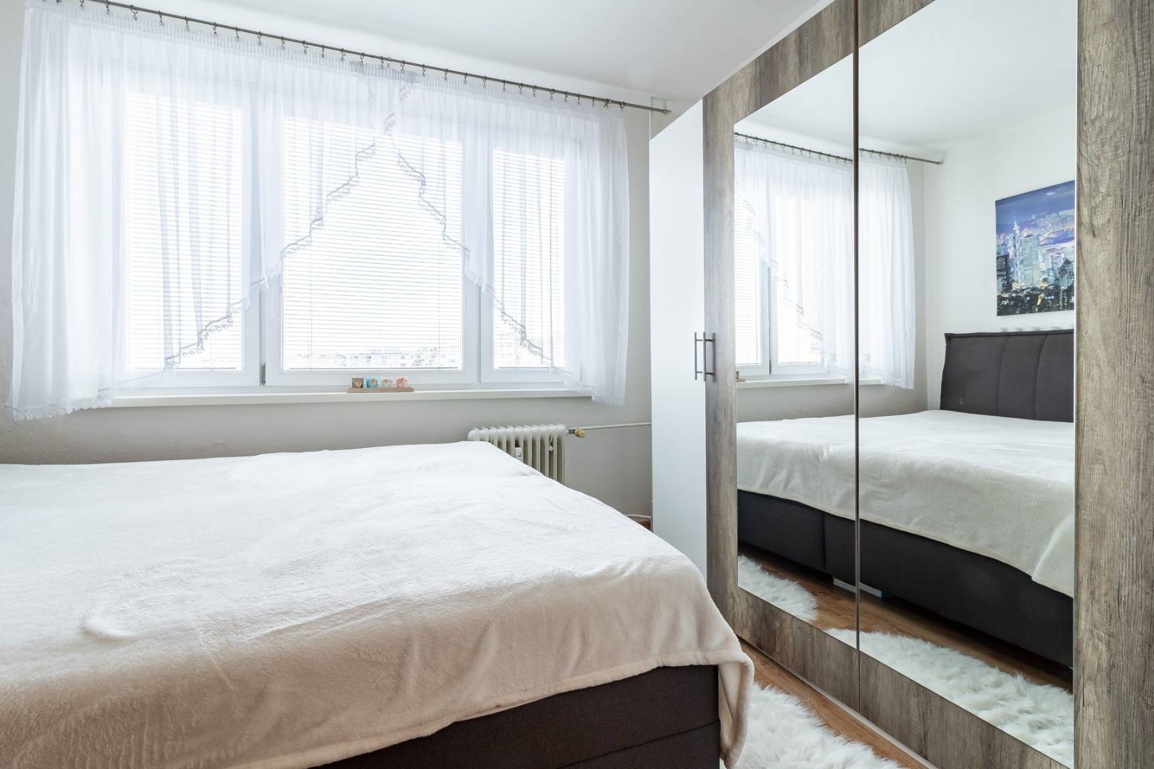 Spálňa : Položená plávajúca podlaha, plastové okná.