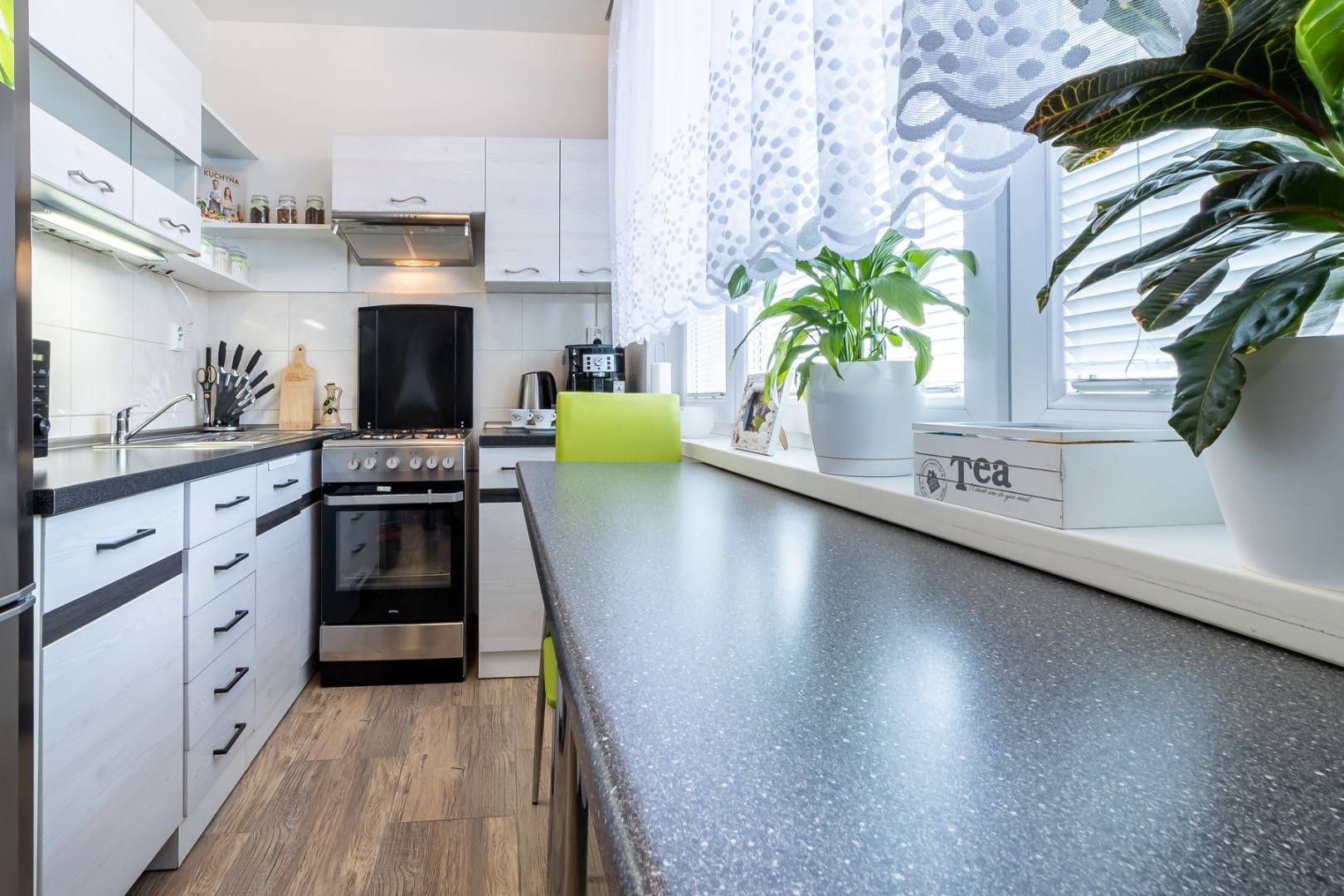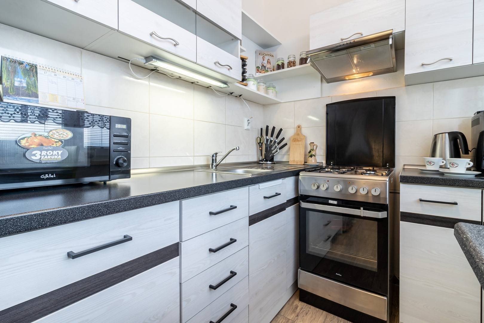 Kuchyňa pozostáva z nerezového drezu, umývačky riadu BEKO 45cm, digestora, chladničky a samostatného kombinovaného sporáku ( plynová doska + elektrická rúra )