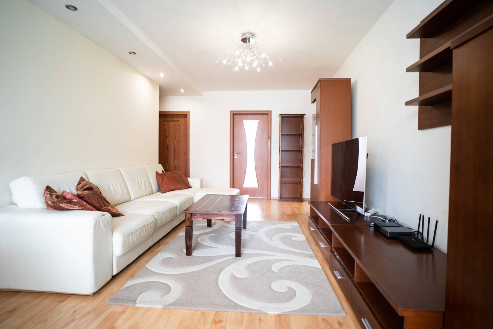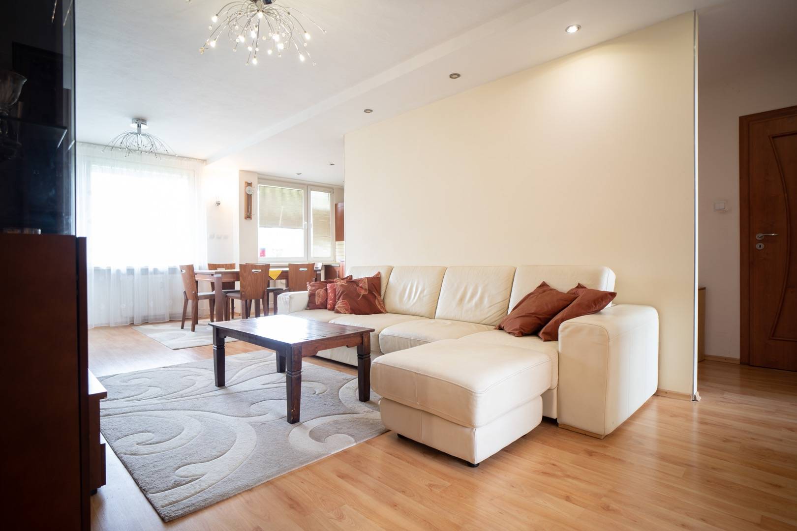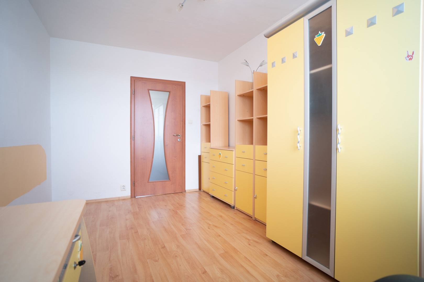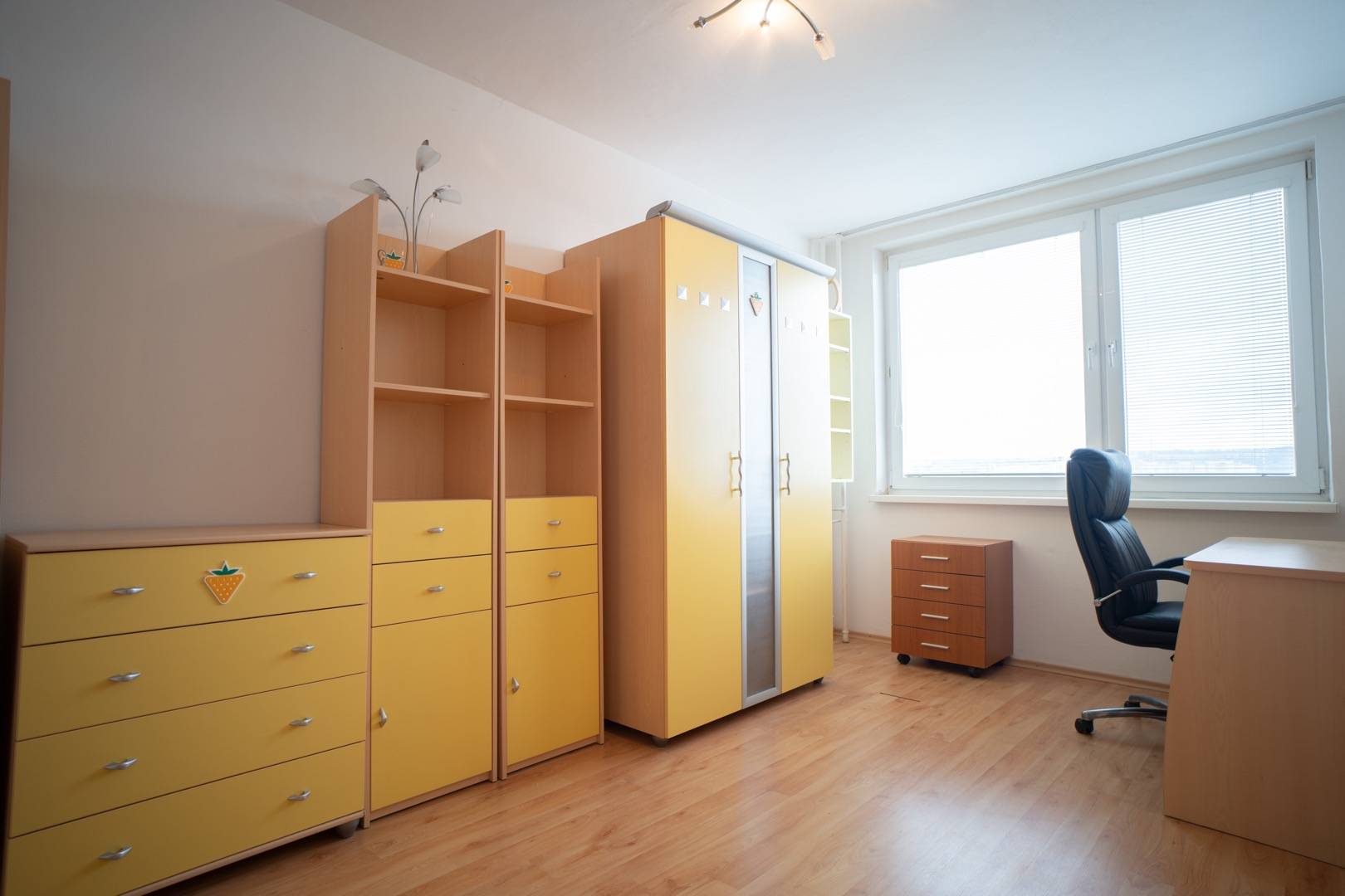 Dispozičné riešenie: Byt sa skladá zo vstupnej chodby, priestrannej obývačky prepojenej s kuchyňou, troch samostatne nepriechodných izieb (spálňa a 2 študentské izby), kúpeľne a samostatnej toalety.