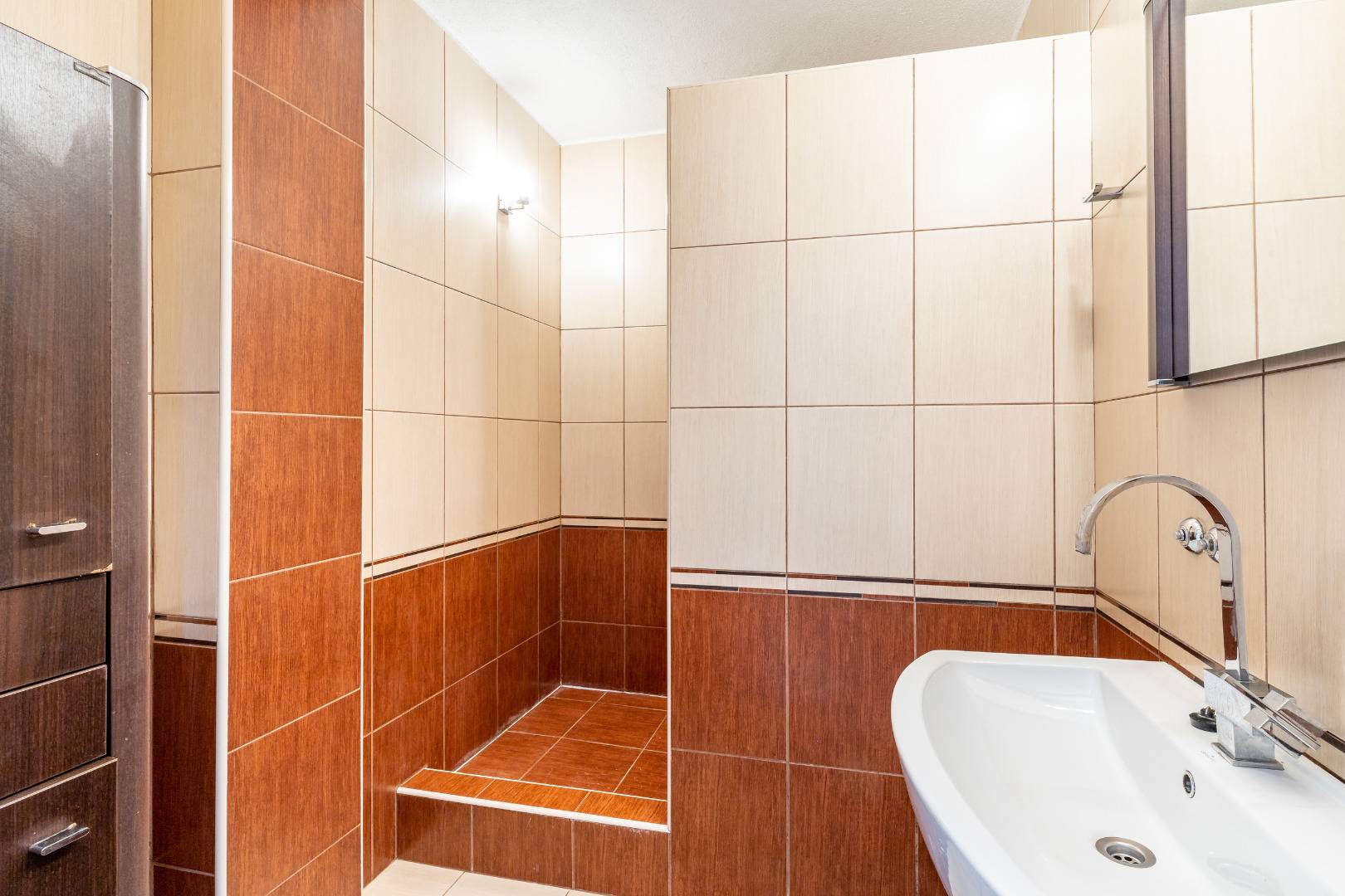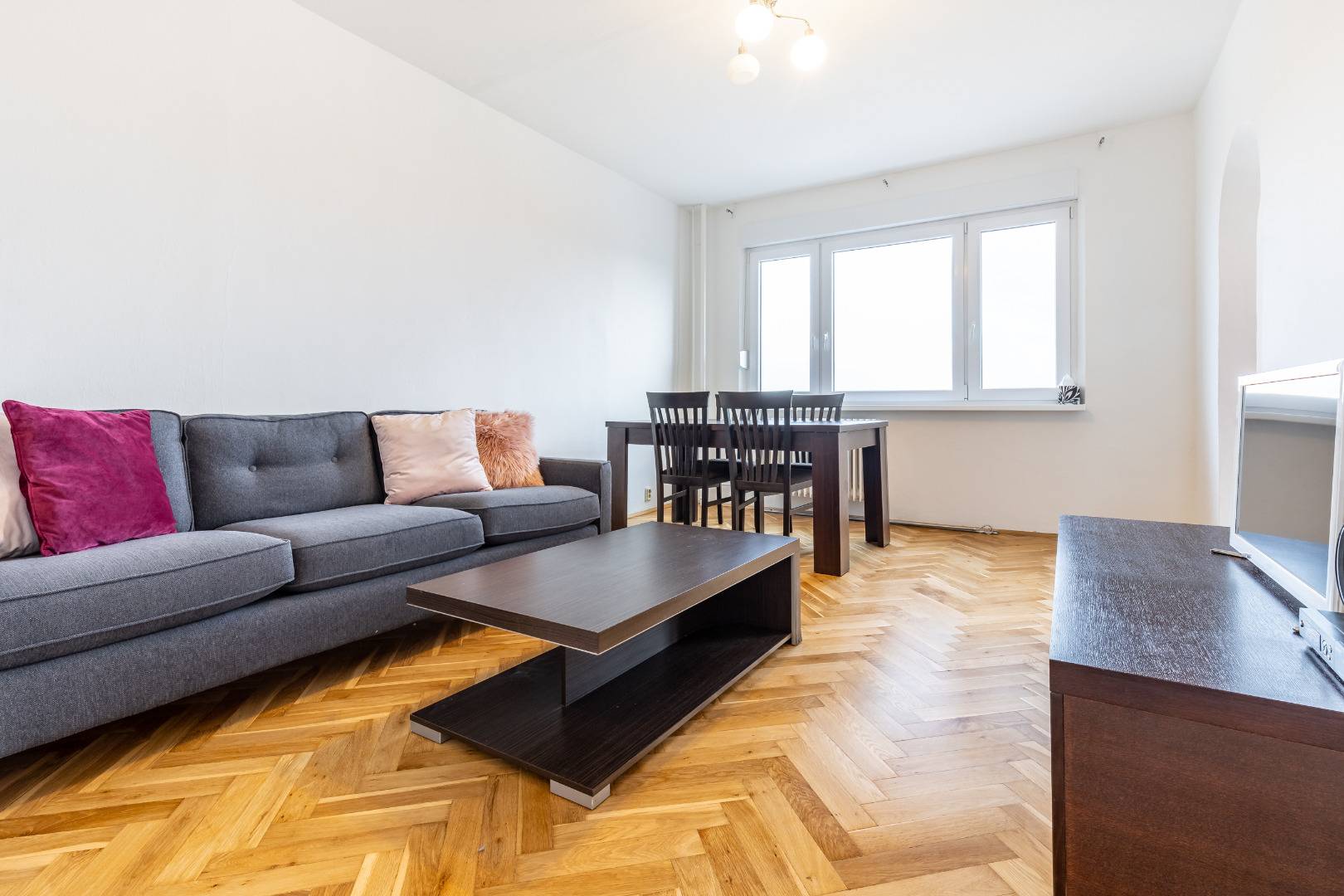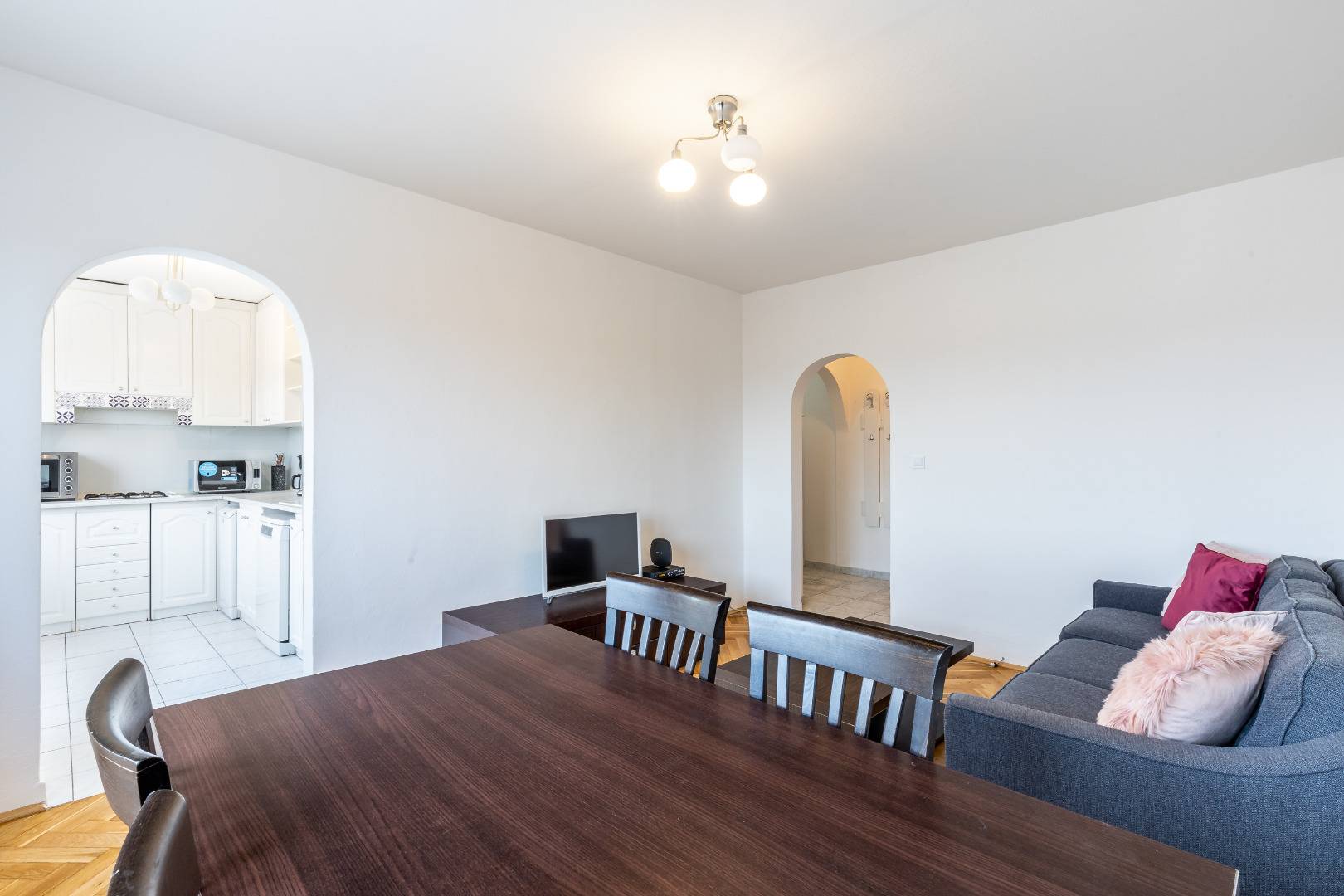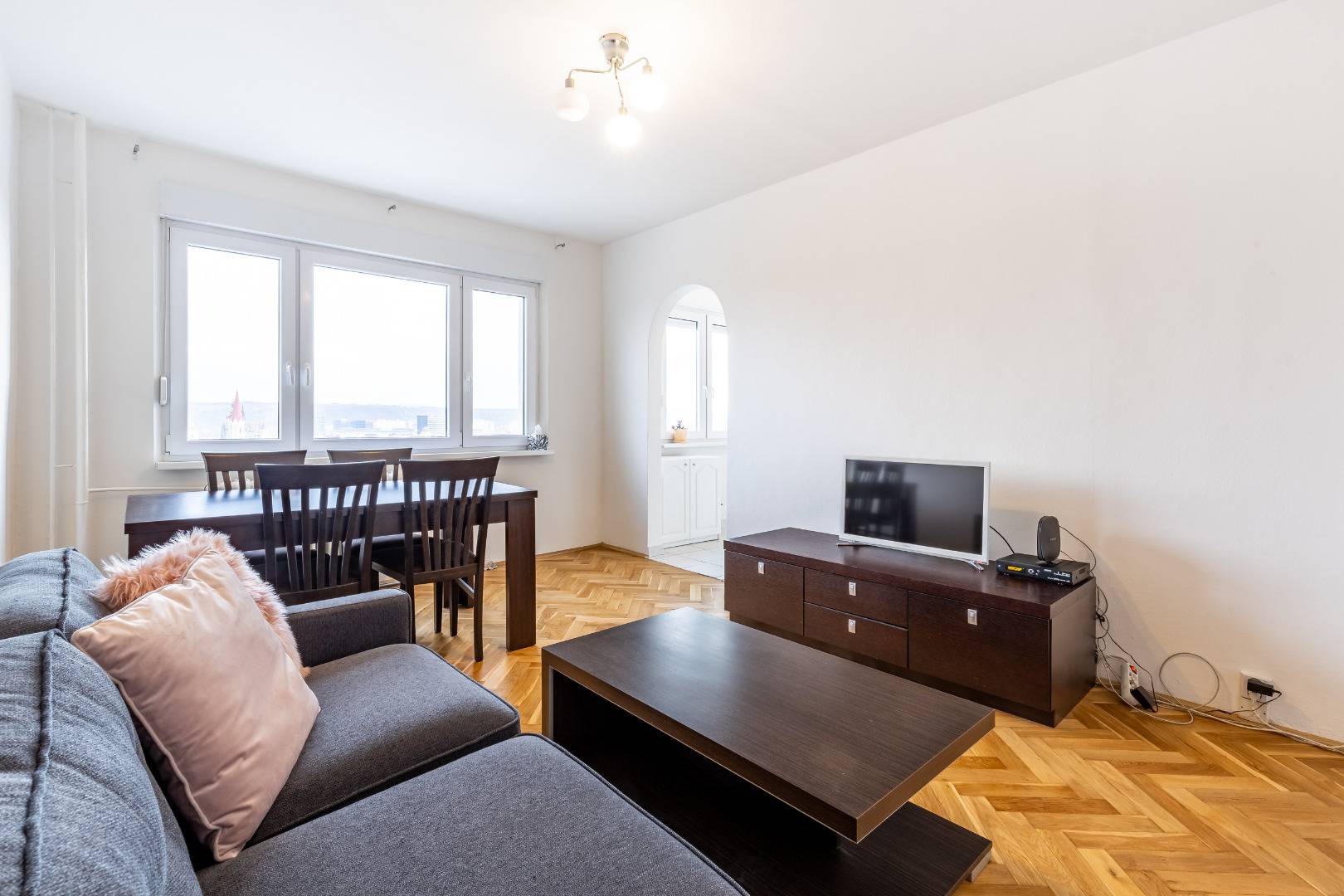 Byt je zrekonštruovaný a kompletne zariadený a vybavený. Pozostáva z obývacej izby s prechodom do kuchyne, dvoch spální, samostatnej kúpeľne, toalety, veľkej komory a chodby. V obývačke sa nachádza pohovka, konferenčný stolík, jedálenský stôl so stoličkami a televízor. Kuchyňa je komplet vybavená spotrebičmi (varná doska, chladnička, menší sporák, práčka, digestor, mikrovlnka). V spálni sa nachádza manželská posteľ, veľká skriňa a písací stôl. V kúpeľni je sprchovací kút.